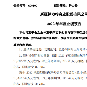 1月30日晚,新疆白酒上市企业伊力特发布业绩预告称,经财务部门初步测算,预计实现归属于母公司所有者的净利润1.66亿元左右,与上年同期的3.13亿元相比,预计减少1.47亿元左右,同比减少46.90%;扣非净利润为1.55亿元左右,与上年同期的3.14亿元相比,预计减少1.59亿元左右,同比减少50.78%。