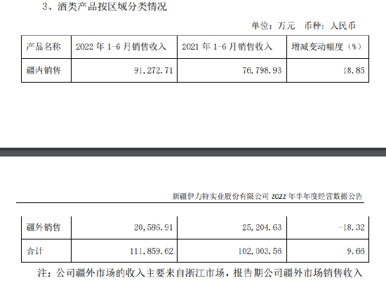 从公司营收看,2018年2021年,伊力特新疆地区的收入为14.93亿元、17.03亿元、12.03亿元、14.16亿元,而新疆以外地区的收入为5.48亿元、5.73亿元、5.90亿元、5.00亿元。整体业绩出现一定程度的下滑。2022年上半年,疆外市场销售收入更是下降了 18.32%。