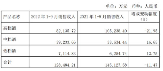 从经营数据看,产品层面,伊力特有七成的营收由高档酒贡献。不过,2022年前三季度,伊力特高档的销售收入却下滑超两成。2022年1-9月,伊力特高档酒、中档酒以及低档酒分别实现销售收入8.21亿元、3.92亿元以及0.71亿元,同比减少21.95%、增加16.65%以及增加13.75%。