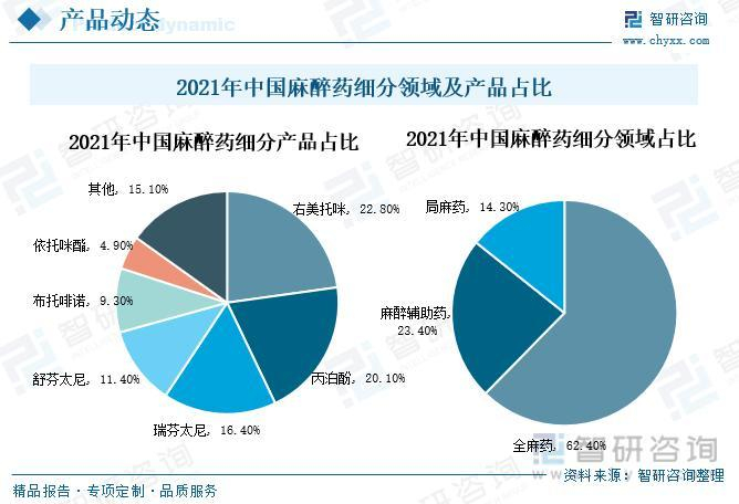 全球麻醉药市场以全麻药为主,据有关资料显示,欧美等发达地区全麻手术占比达到90%以上。从我国麻醉药细分领域占比情况来看,当前我国麻醉药市场也以全麻药为主,其占全国麻醉药的比重为62.4%。麻醉辅助剂和局麻药占全国麻醉药领域的比重分别为23.4%、14.3%。自麻醉药行业发展以来,国家颁布了多项麻醉药法律法规及管理条例,对麻醉药的品类、生产企业、流通及使用都作出了明确规定与严格限制。尽管近年来我国麻醉药的应用在逐渐开放,但当前麻醉药的应用范围仍然较窄。从全国麻药细分产品占比情况来看,麻醉药中右美托咪、丙泊酚、瑞芬太尼应用广泛,比重分别达到了22.8%、20.1%、16.4%。舒芬太尼、布托啡诺、依托咪酯在全国麻醉药中占比分别为11.4%、9.3%、4.9%。