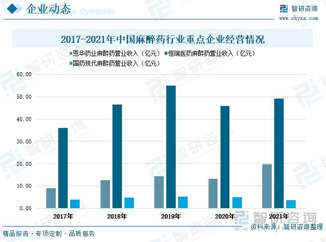 从市场格局方面来看,受政策壁垒以及技术壁垒的影响,我国麻醉药行业进入壁垒较高,麻醉药生产企业及销售企业数量较少,新进入者竞争力弱,因而当前市场格局相对集中。全国麻醉药市场的三大龙头分别是人福医药、恒瑞医药和恩华药业,麻醉药市场呈现出一定的寡头垄断格局。在全国经济稳定发展、疫情取得良好防控的形势下,我国麻醉药行业重点企业的整体经营情况向好,龙头企业的麻醉药营业收入明显高过其他企业,在全国麻醉药行业处于遥遥领先地位。