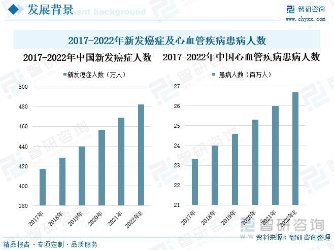由于不良饮食习惯增多、环境恶化污染加重、社会生活压力增大、人类平均寿命增加等多种因素影响,近年来我国新发癌症人数和心血管疾病患病人数均逐年增长。根据统计数据显示,2021年全国新发癌症人数为468.8万人,同比上升了2.6%,相较2017年全年新发癌症人数增加了51.6万人。预计2022年新发癌症确诊人数将继续上升至482万人。根据调查结果显示,2017-2021年期间全国心血管疾病患病人数也呈连年增长趋势。2021年全国心血管疾病患病人数已达到约2600万人,同比增长2.77%,比2017年全国心血管疾病患病人数增加了约270万人。心血管疾病、癌症等高致死率疾病的逐渐盛行,将导致全国手术量不断增加,而该类严重疾病的手术治疗常需使用麻醉,因而将推动我国麻醉药市场的持续增长。