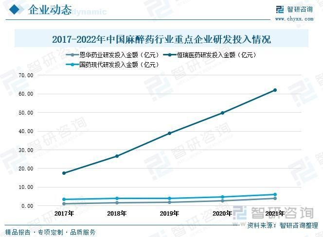 从我国麻醉药行业重点企业的研发投入情况来看,近年来恒瑞医药的研发投入金额持续高速增长,且明显高过其他企业。2021年恒瑞医药研发投入金额达到62.03亿元,同比增长24.3%,相较2017年研发金额增加了44.4元。2017-2021年期间,恩华药业和国药现代的研发力度也逐渐加大,其在2021年的研发投入金额分别为4.02亿元、5.95亿元,增速分别为50.9%、23.4%。
