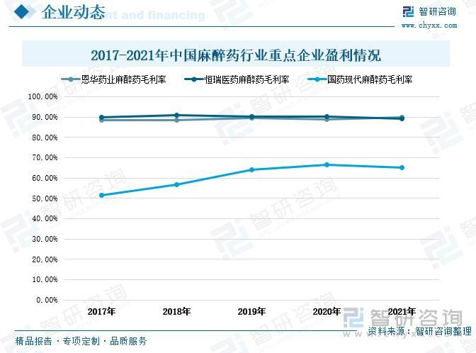 从盈利情况来看,近年来全国麻醉药行业重点企业的麻醉药盈利情况较好,尤其是行业龙头企业,凭借生产规模化、产业链整合、经营经验丰富、生产技术领先等优势,实现了麻醉药业务的高收益。2017-2021年期间,龙头企业恩华药业和恒瑞医药的麻醉药毛利率稳定保持在高水平,其毛利率范围区间分别为88.38%-89.97%、89.08%-90.93%。2017-2020年国药现代的麻醉药毛利率由51.54%连年增长至66.3%,在2021年毛利率略有下滑至65.03%。