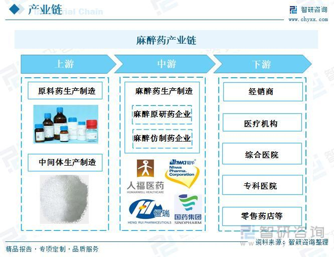 从产业链角度看,麻醉药产业的上游行业主要包括麻醉药中间体和原料药等,原料药是指用于生产各类制剂的原料药物,是药品生产必不可少的基础原料,目前我国是全球主要化学原料生产地之一,原料药产能居世界第一。中游为麻醉药的生产与制造,包含麻醉原研药企业和麻醉仿制药企业等。下游为麻醉药的销售渠道,主要有经销商、医疗机构和零售药店等。