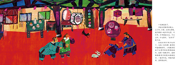 这本书绘者借鉴了年画的手法,采用厚重的水粉颜料,画出浓墨重彩的民俗氛围,并且给人物加以粗犷的勾线,使得动作表现生动有力。故事的时代背景设定为20世纪五六十年代,人物的服饰、孩子的玩具、生活的用具,都有意识地推移到那个年代,和现代社会拉开一段距离,呈现出质朴的乡土气息。