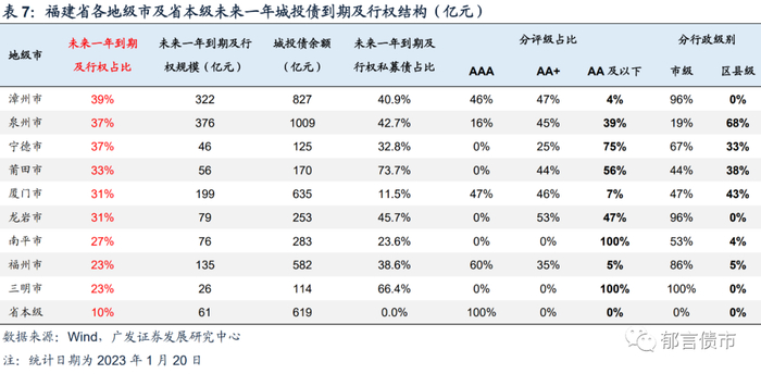 分区域来看,漳州、泉州和宁德未来一年城投债到期及行权占比较高,在35%以上,其中漳州和泉州到期及行权规模也较大,分别为322亿元和376亿元。莆田次之,占比为33%,且其私募债到期及行权规模占比较高,达73.7%。而后是厦门和龙岩,在31%左右,其中厦门规模较大,为199亿元,但主要是AA+及AAA城投债到期,合计占比93%。