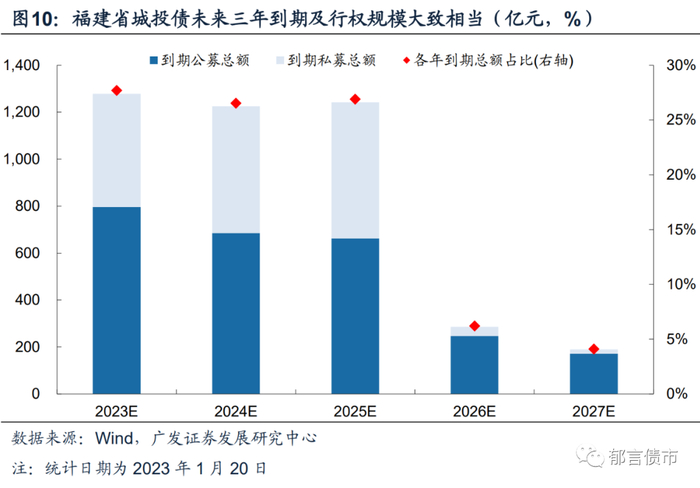 福建省城投债未来三年到期及行权规模大致相当,2023年、2024年和2025年到期及行权规模分别为1278.5亿元、1224.7亿元、1242.2亿元,分布较为均匀。