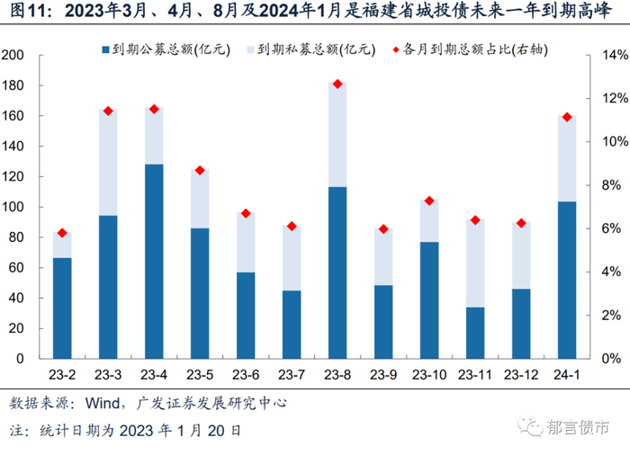 截至2023年1月20日,福建省城投债余额为4616.6亿元,涉及发行人92家,其中AA+及以上平台数量占比近一半。从区域分布来看,泉州、漳州、厦门、省本级、福州存量债余额较大,在500亿元以上,合计约占全省存量债余额8成,其余地级市城投债规模较小,不足300亿元,平台数量介于4-8家。从未来一年城投债月度到期及行权节奏来看,2023年8月是高峰,到期及行权规模为182.3亿元。