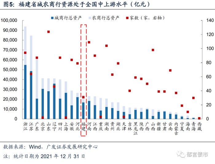 福建省金融资源处全国上游,12家全国性股份制商业银行之一的兴业银行总行设在福州。此外,福建省还有31家城农商行,其中城商行4家,农商行27家,披露数据的城农商行总资产逾2.4万亿元,排全国第11位。分地级市来看,主要集中在厦门、福州和泉州,其中厦门有3家城农商行,总资产逾1.4万亿元,福州和泉州分别有6家城农商行,总资产在3500亿元左右。