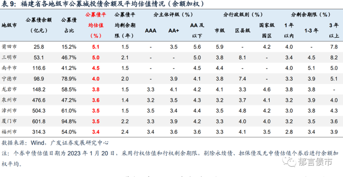 从公募城投债平均估值来看,多数地级市在4.0%以下。其中,莆田和三明公募城投债平均估值较高,在5.0%左右,两市经济财政实力及金融资源均处省内下游。南平和宁德次之,为4.0-4.5%,其中南平经济财政实力排省内倒数第1位。其余地级市平均估值均在4.0%以下,其中福州和厦门城投债收益率最低,主要由于经济财政实力较强,城投债务率处省内偏低水平,并且金融资源丰富。