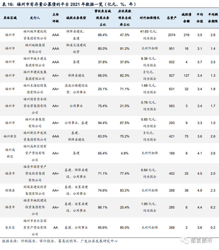 平台概况方面,福州共有16家存量债平台,其中市级平台7家,区县级平台7家,国家级园区平台2家。7家市级平台按照职能大致可划分为基建、公用事业、交通3类,其中基建类平台3家,公用事业类平台2家,交通类平台2家。
