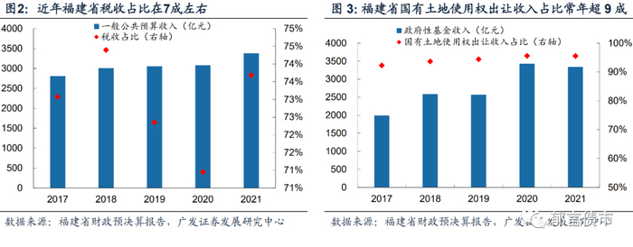 财政方面,2021年福建省一般公共预算收入为3383亿元,排全国第11位,增速为9.9%,排全国第17位;税收收入占比为73.7%,排全国第12位,较2020年提升2.7个百分点。政府性基金收入为3343亿元,较2020年下降2.5%,其中国有土地使用权出让收入为3193亿元,占比95.5%。