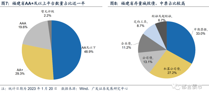 福建省城投债在本轮债市调整中上行幅度较小,且修复较快。在2022年11月10日至2022年12月16日的上行阶段,福建省城投债收益率上行116bp,上行幅度排全国第5低。并且隐含评级AAA这种强资质城投债上行幅度更小,仅64bp,为全国最低。随后城投债收益率转为下行,福建省下行幅度较大,修复较快。2023年1月20日相较2022年12月16日,福建省城投债收益率下行32bp,排全国第5高。其中,隐含评级AA和AA+城投债下行幅度更大,超过35bp。