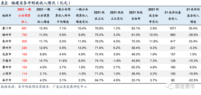 位列GDP第二梯队的厦门和漳州,2021年一般公共预算收入分别为881亿元和246亿元,排省内第1和第4,增速均处于12%以上的较高水平。其中,厦门财政自给率较高,为83.1%,排省内第1,并且政府性基金收入增长30.4%,增速也排省内第1。债务负担方面,厦门2021年城投债务率为224%,为省内第2低,而漳州为652%,为省内第2高。