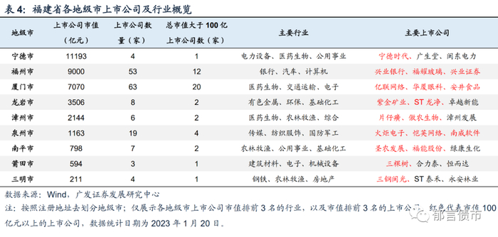 截至2023年1月20日,注册地址在福建省的A股上市公司有167家,总市值达35677亿元,数量和总市值均排全国第7位,主要集中在电力设备、银行、有色金属三大行业,三大行业总市值超过福建省上市公司总市值的一半。