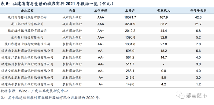截至2023年1月20日,福建省有11家城农商行有存量债。其中厦门国际银行和厦门银行主体评级均为AAA,2021年末总资产分别为10071.7亿元和3294.9亿元,排省内前2。厦门国际银行曾是中国第一家中外合资银行,2013年从中外合资银行改制为中资商业银行。厦门银行是大陆首家具有台资背景的城市商业银行,也是福建省首家上市城商行。
