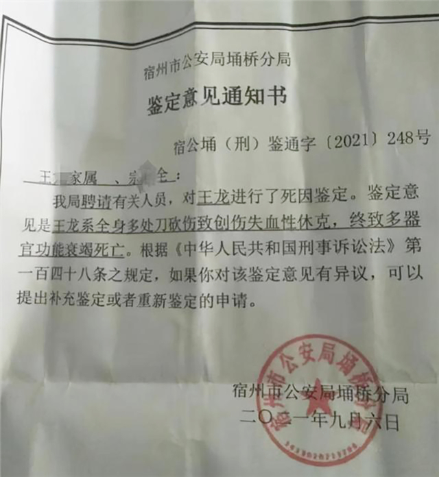 2月2日,王龙的母亲何本俊向宿州市人民检察院递交了刑事抗诉申请书。何本俊的丈夫18年前患病去世,如今她又不得不承受失子之痛。她认为,被告人向他儿子挥砍多刀,十分残忍。