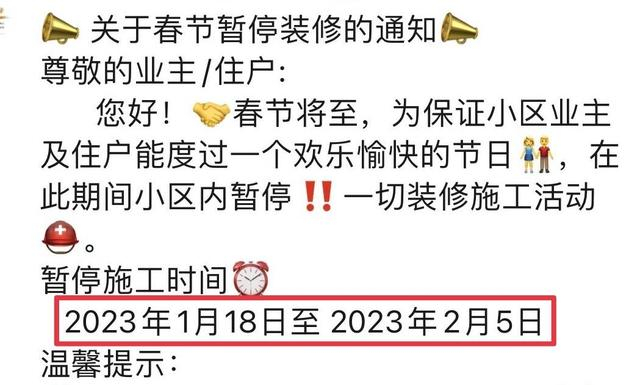不过,宋先生却发现物业公司的楼栋管家发出了一则“关于春节暂停装修的通知”。该通知称,为保证小区业主及住户能度过一个欢乐愉快的节日,2023年1月18日至2023年2月5日小区内暂停一切装修施工活动。