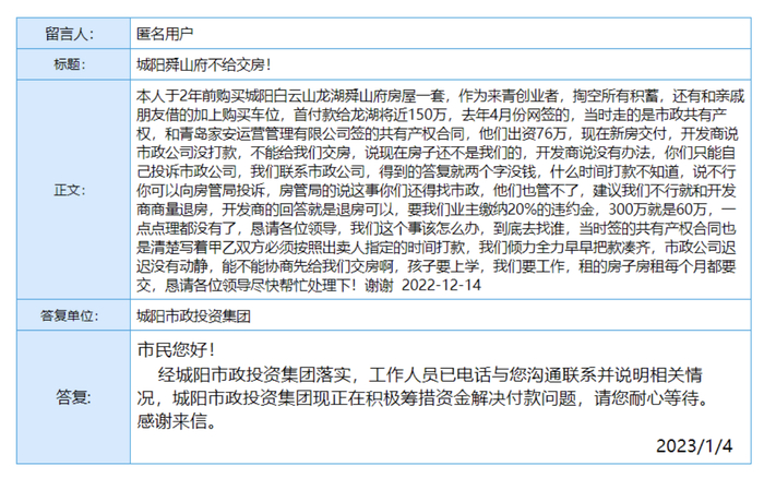 在青岛城阳区区长信箱留言中,有购房者称,“城阳舜山府不给交房”。该名购房者在留言中表示,自己在两年前购买了城阳白云山龙湖舜山府房屋,买的是市政共有产权房,和青岛家安运营管理有限公司签订的共有产权合同,公司出资76万元。现在新房交付,开发商表示市政公司没有打款,不能交房。城阳市政公司表示没钱。如果要退房,业主需要缴纳20%的违约金,300万元的房款即需要支付60万元的违约金。