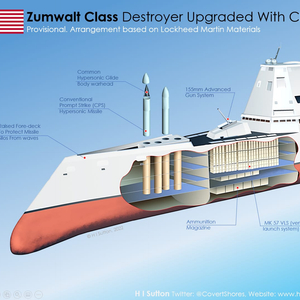 此前美国海军已经确定将“朱姆沃尔特”号舰首的一门155毫米舰炮拆除,换装4座弗吉尼亚级核潜艇同款的直径为87英寸(约2210毫米)的发射管,该型发射管能够容纳3枚CPS导弹,也就意味着每艘改造之后的朱姆沃尔特级驱逐舰都能够12枚CPS高超音速导弹。