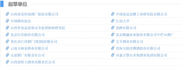 全国标准信息公共服务平台显示,清香新国标主要起草单位有:山西杏花村汾酒厂股份有限公司、中国食品发酵工业研究院有限公司、中国酒业协会、江南大学、山西省食品质量安全监督检验研究院、北京红星股份有限公司、北京顺鑫农业股份有限公司、北京顺鑫农业股份有限公司牛栏山酒厂等15家企事业单位。