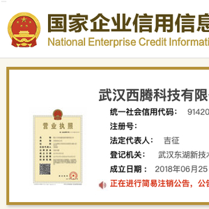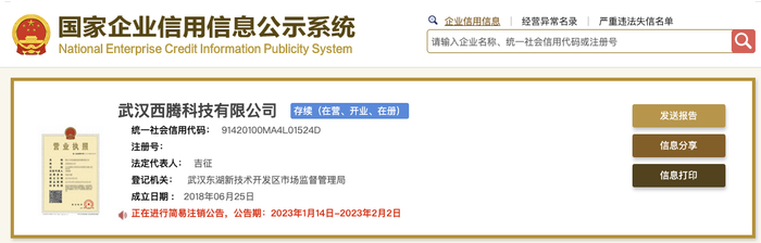 国家企业信用信息公示系统网站显示,武汉西腾科技有限公司新增简易注销公告,公告期自2023年1月14日至2月2日。