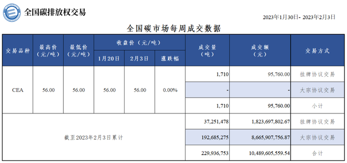 截至本周,全国碳市场碳排放配额(CEA)累计成交量229,936,753吨,累计成交额10,489,605,559.54元。