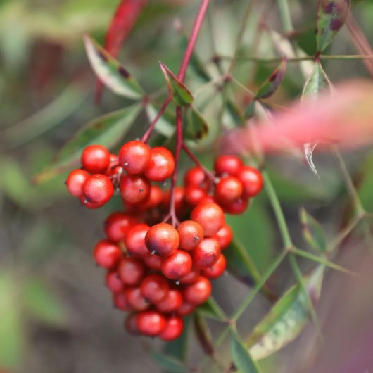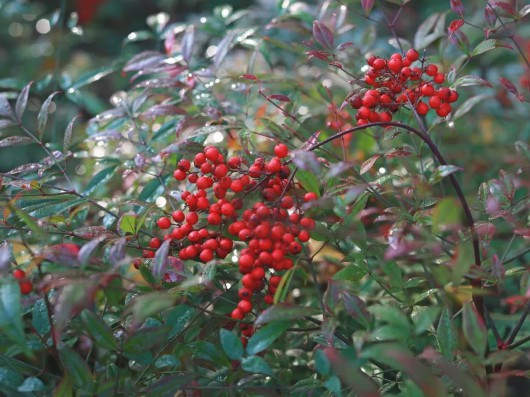 南天竹在冬日里叶色泛彩,枝纤细多姿,其叶似竹。枝头的红色果实簇拥在一起,成一串串红色的果穗,特别亮丽。在萧瑟冬日里,传递出融融暖意。