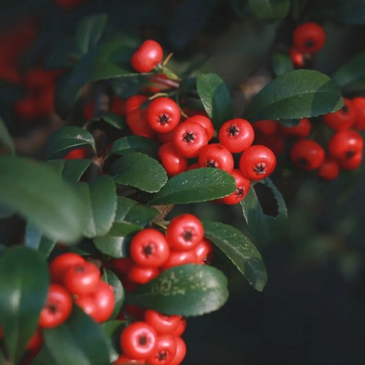 火棘树形优美,果实存留枝头甚久。常常在一堆灌木丛中红红火火地脱颖而出,果实红豆大小,挂在枝子上一串串的,犹如冬日里的暖阳。