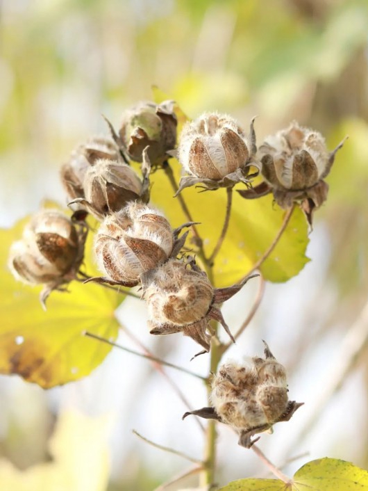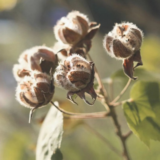 冬日木芙蓉娇艳的花凋谢了,木色的花苞干枯蜷缩,枝头顶了开裂的五边形蒴果,包裹着细密的白色绒毛,在冬日阳光下泛着银光,干枯的色调显得有些凄美,却又多了一份沉稳。