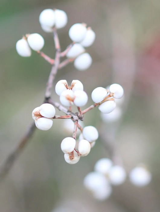 寒冷的冬日,当乌桕叶子落尽之时,就是雪白的四瓣小果实挂满枝梢的时候。远看仿佛一树白梅,近看又像一朵朵小棉花,美得无声而又简单。