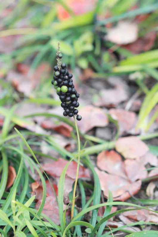 麦冬是路边最常见的草本植物,细长的叶子似韭,柔软地垂向地面。拨开它的叶子,一串串深蓝色的果实挺立在翠叶之上,犹如一颗颗蓝宝石,珠圆玉润,光泽可鉴。