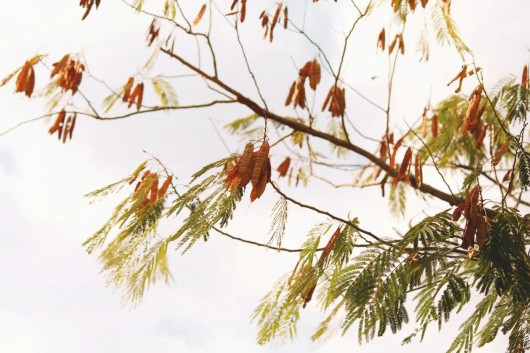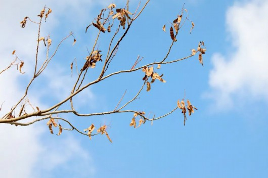紫荆的果实很像豆荚,一串串、一簇簇的紫荆果实一眼望去,状如豆角。秋收冬藏,它藏在树颠,藏在蓝天之间。