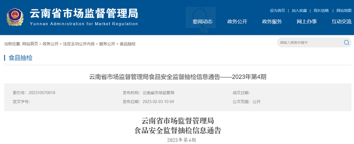 中国质量新闻网讯 2023年2月3日,云南省市场监管局网站发布2023年第4期食品安全监督抽检信息。本期抽检10个大类食品495批次样品,11批次样品不合格、484批次样品合格。合格产品信息见下表。