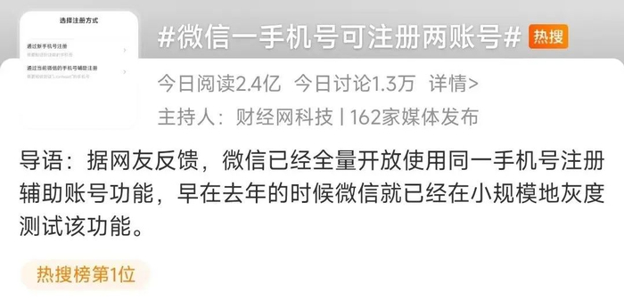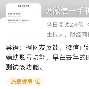 2月3日消息,微信平台显示,使用同一手机号注册辅助账号的功能已全量开放。