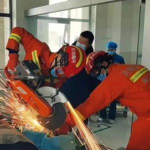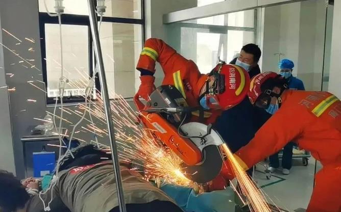 消防、医生通力合作,经过两个半小时的辛苦作业,中午12点32分,机器终于被成功破拆。消防救援人员为患者生命通道打开了第一道屏障。