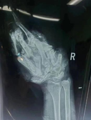 然而对医生们来说,考验才刚刚开始。刘本全介绍,以前接诊过的绞肉机绞手案例,患者多为一根、两根手指被绞,而此患者整个右手被绞,受损情况十分严重。经检查诊断,患者右手严重挤压毁损伤,手腕及手掌、手指多平面撕脱离断,手部掌指骨多发粉碎性骨折脱位,右手皮肤大面积撕脱伤伴缺损。在场大部分医护人员,包括手外科的年轻医护面对此情况都认为患者只能截肢了。