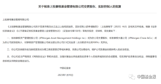 2023年,在摩根士丹利华鑫之前,上投摩根已经成为国内第6家外商独资的公募基金管理人。据悉,在1月19日,证监会官网核准摩根资产管理控股公司(JPMorganAsset Management Holdings Inc.)成为上投摩根基金主要股东;核准摩根大通公司(JPMorgan Chase & Co.)成为上投摩根基金实际控制人。该项变更完成后,摩根资管对上投摩根基金持股比例达100%。