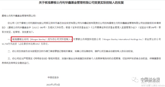 批复中称,核准摩根士丹利(Morgan Stanley)成为摩根士丹利华鑫基金实际控制人;对摩根士丹利国际控股公司(Morgan Stanley International Holdings Inc.)依法受让摩根士丹利华鑫基金12,750万元出资(占注册资本比例51%)无异议。