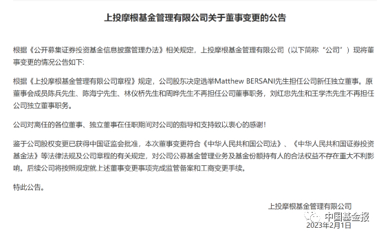 紧接着,上投摩根基金在2月1日发布董事变更公告称,根据公司章程规定,公司股东决定选举Matthew BERSANI担任公司新任独立董事,原董事会成员陈兵、陈海宁、林仪桥、周晔不再担任公司董事职务,刘红忠、王学杰不再担任公司独立董事职务。