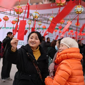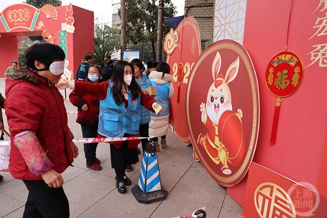 摸福游戏区,参与群众戴上眼罩,原地转一圈,小心翼翼往前走,双手摸向目标区域的福字,摸到福的群众还能获得一张福券。无论是知识抢答,还是灯谜竞猜等活动区域,参与的群众都有机会获得一份小礼品。