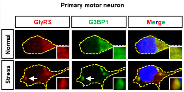 运动神经元中的应激颗粒。在应激情况下,原本弥散分布在细胞质中的G3BP蛋白迅速组装形成应激颗粒(如箭头所示绿色颗粒状结构),与此同时CMT2D致病蛋白GlyRS也被招募至其中(如箭头所示红色颗粒状结构)。蓝色部分为DAPI标记的细胞核。图片来源:浙江大学
