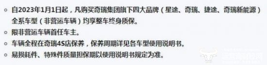 据了解,奇瑞宣布的整车终身质保政策为:自2023年1月1日起,购买奇瑞集团旗下四大品牌全系车型,均可享整车终身质保。因此在今年以前购车的老车主并不能享受该项政策。