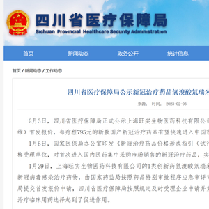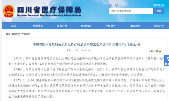 2月3日,四川省医保局公示了新冠治疗药品氢溴酸氘瑞米德韦片(商品名:民得维)首发报价,每盒为795元(36片/瓶)。