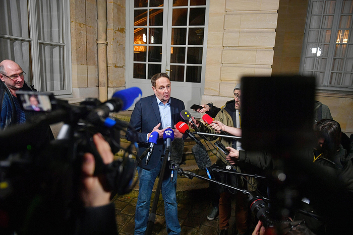 当地时间2023年1月4日,法国巴黎,法国自治工会联盟秘书长艾斯库尔在马蒂尼翁酒店举行的总理和社会伙伴会议后发表新闻声明,这是养老金改革持续磋商的一部分。
