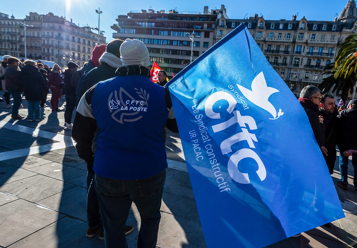 当地时间2023年1月19日,法国土伦,一名示威者在集会中举着CFTC(法国劳工联合会)工会的蓝色旗帜。法国举行大规模罢工反对延迟退休。