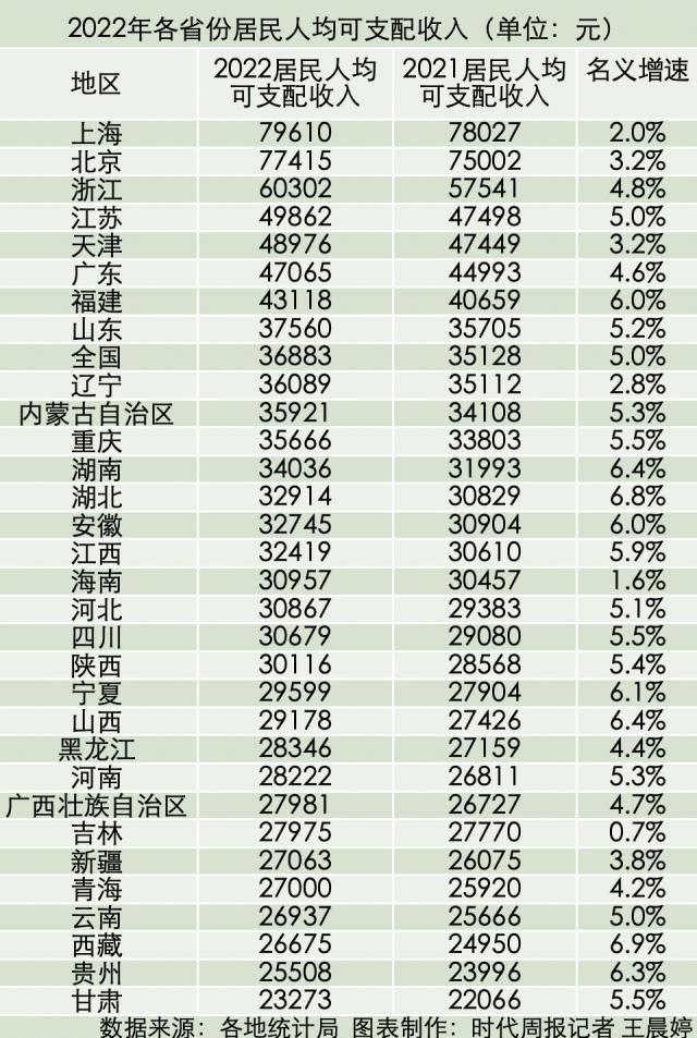 2022年,全国居民人均可支配收入36883元,比上年名义增长5.0%。与之相比,上海、北京、浙江、江苏、天津、广东、福建、山东这8个省份的居民人均可支配收入超过了全国水平。