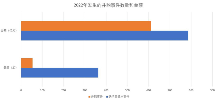 《2022年中国快消品资本报告》显示,2022年中国共发生363起快消品主要资本事件,与2021年相比减少15.4%,涉及金额为785.57亿元,同比减少35.8%。其中,并购事件一共发生54起,占比14.8%;但总涉及金额为611.48亿元,占比77%。由此可见,并购在资本事件中仍是少数。