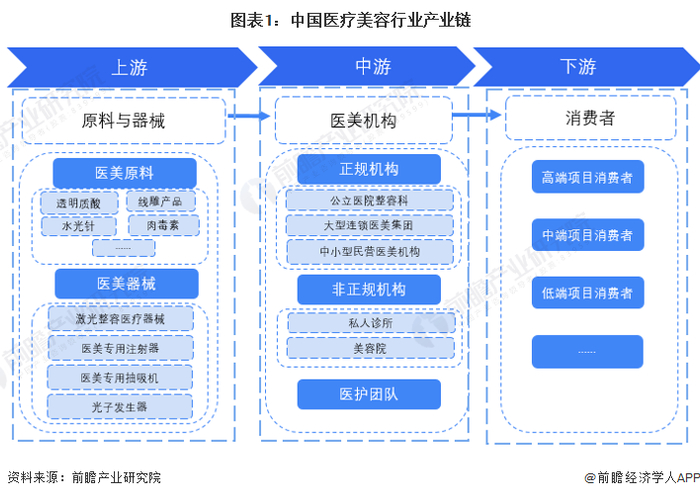 中国医疗美容产业链上游主要包括医美原料供应商和医美器材提供商;中游包括正规机构和非正规机构,其中正规机构主要是指公立医院的整容科、大型连锁医美集团和中小型民营医美机构等,非正规机构是指私人诊所和美容院等;医美行业下游则是消费者,按消费者对价格的敏感程度可分为三类,高端项目消费者、中端项目消费者和低端项目消费者。